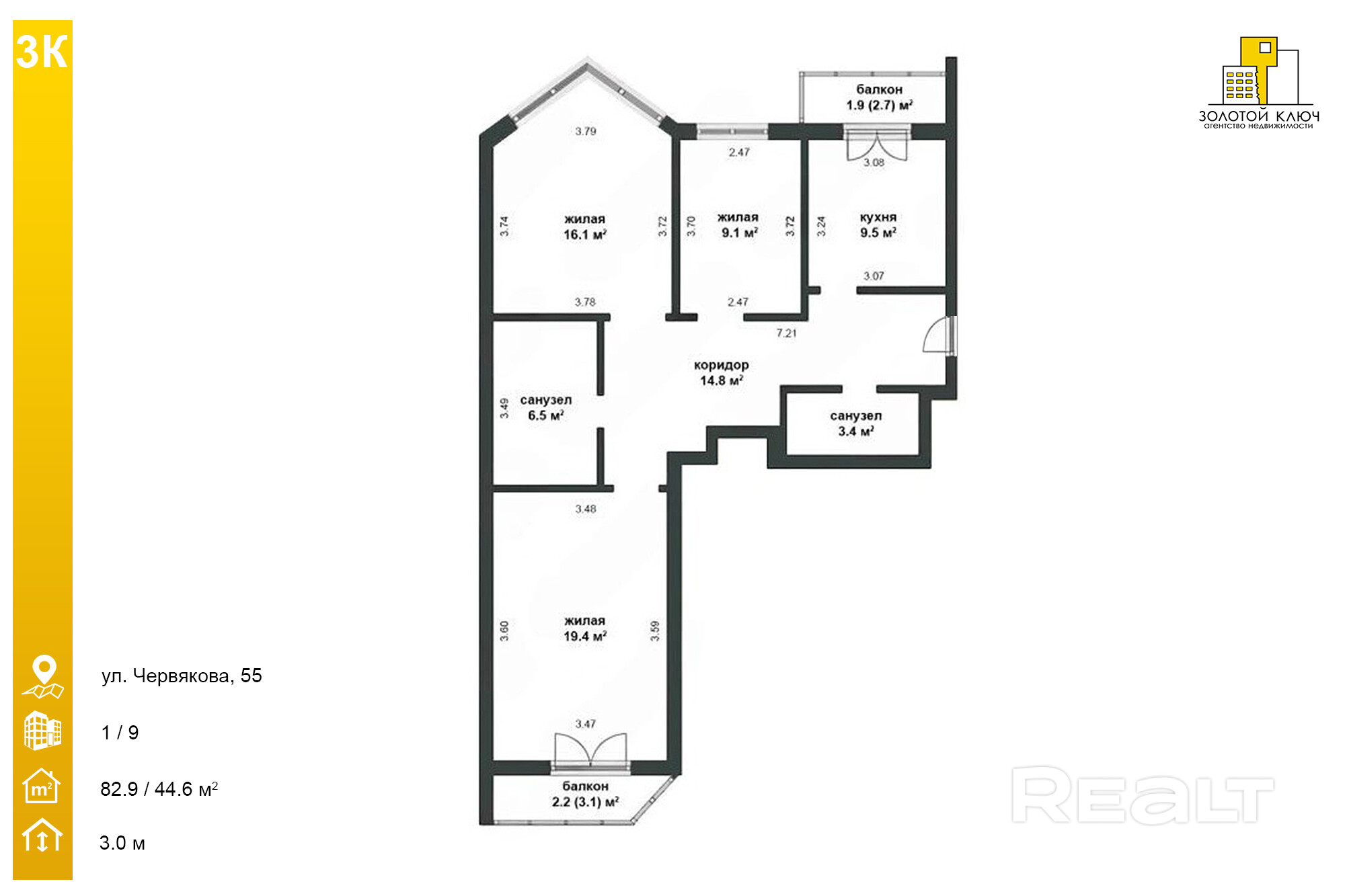 параметры квартиры : 82.9 / 44.6 / 9.5, h=3.0 м.