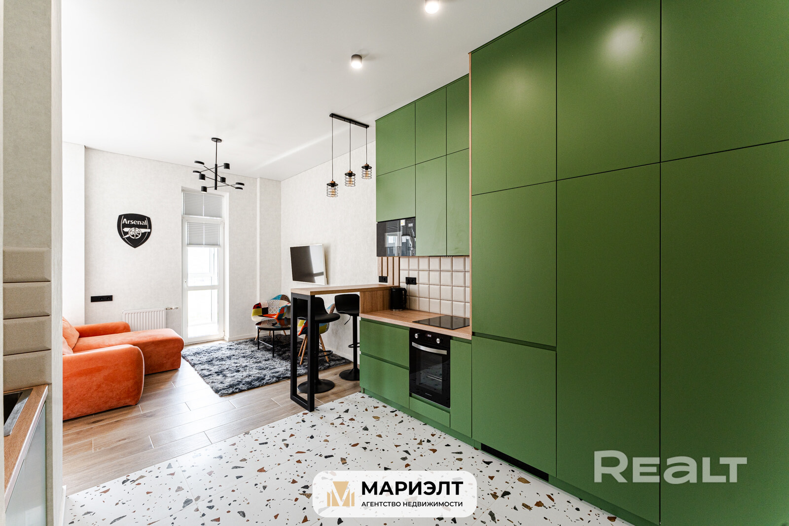 Современный дизайнерский ремонт с интересным сочетанием цветов в интерьере. Использованы только качественных строительные материалы. Стены выровнены и оклеены итальянскими обоями. На полу уложена плитка. В санузле установлена качественная сантехника.