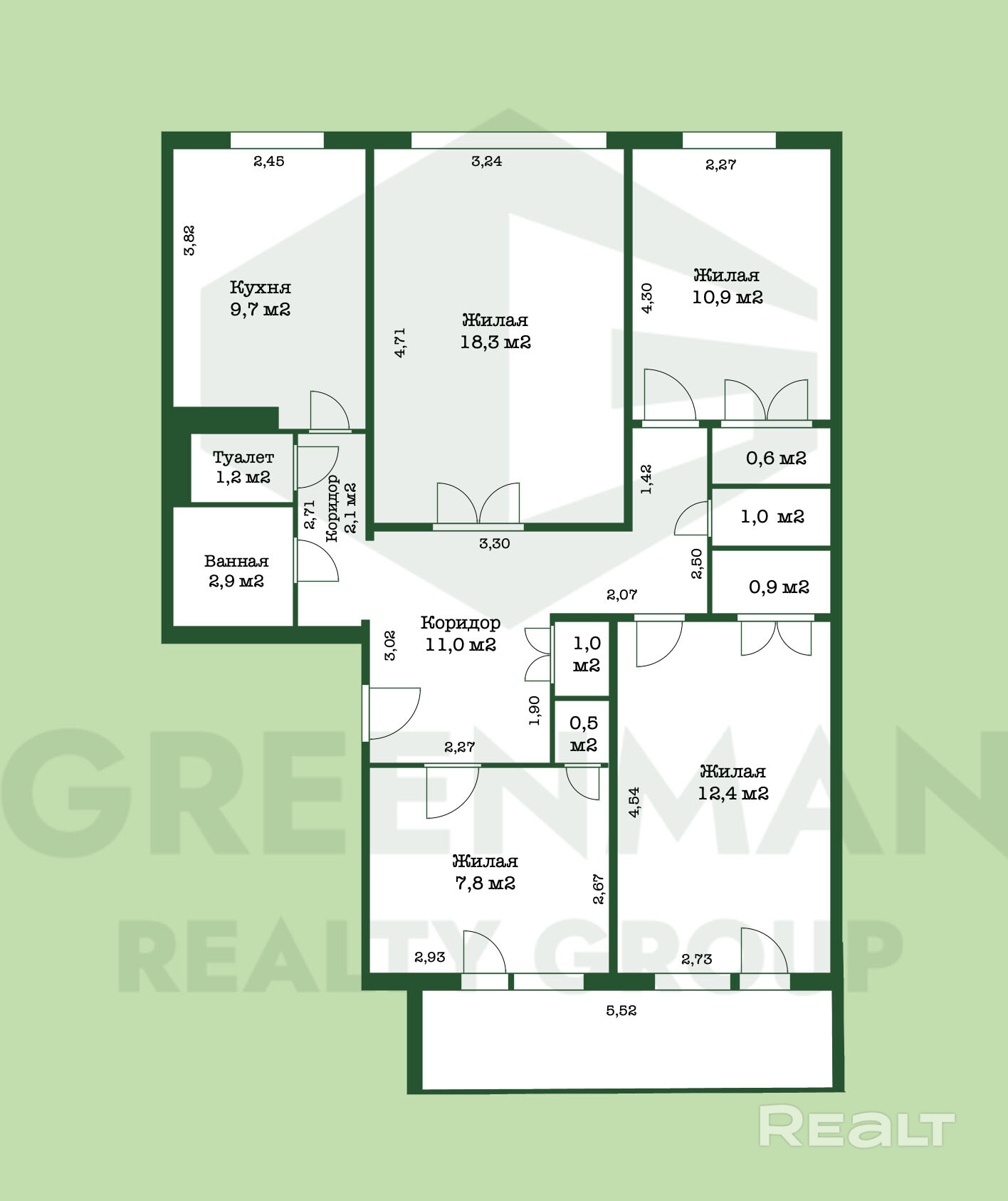 Четыре изолированные жилые комнаты-18,3 кв.м., 12,4 кв.м., 10,9 кв.м., 7,8 кв.м., коридор- 11,0 кв.м., просторная кухня – 9,7 кв.м., большая застекленная лоджия на две комнаты- 6,3 кв.м., санузел раздельный, ванная – 2,9 кв.м., туалет – 1,2 кв.м.