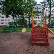 Тихий двор, утопающий в зелени. Во дворе детская площадка.