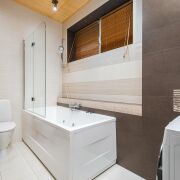 -Два санузла — удобство для семьи и гостей, с активной вентиляцией в обоих. В ванной установлена ванна с гидромассажем, стеклянная перегородка, качественная плитка с фактурным акцентом. Установлена стиральная машина.