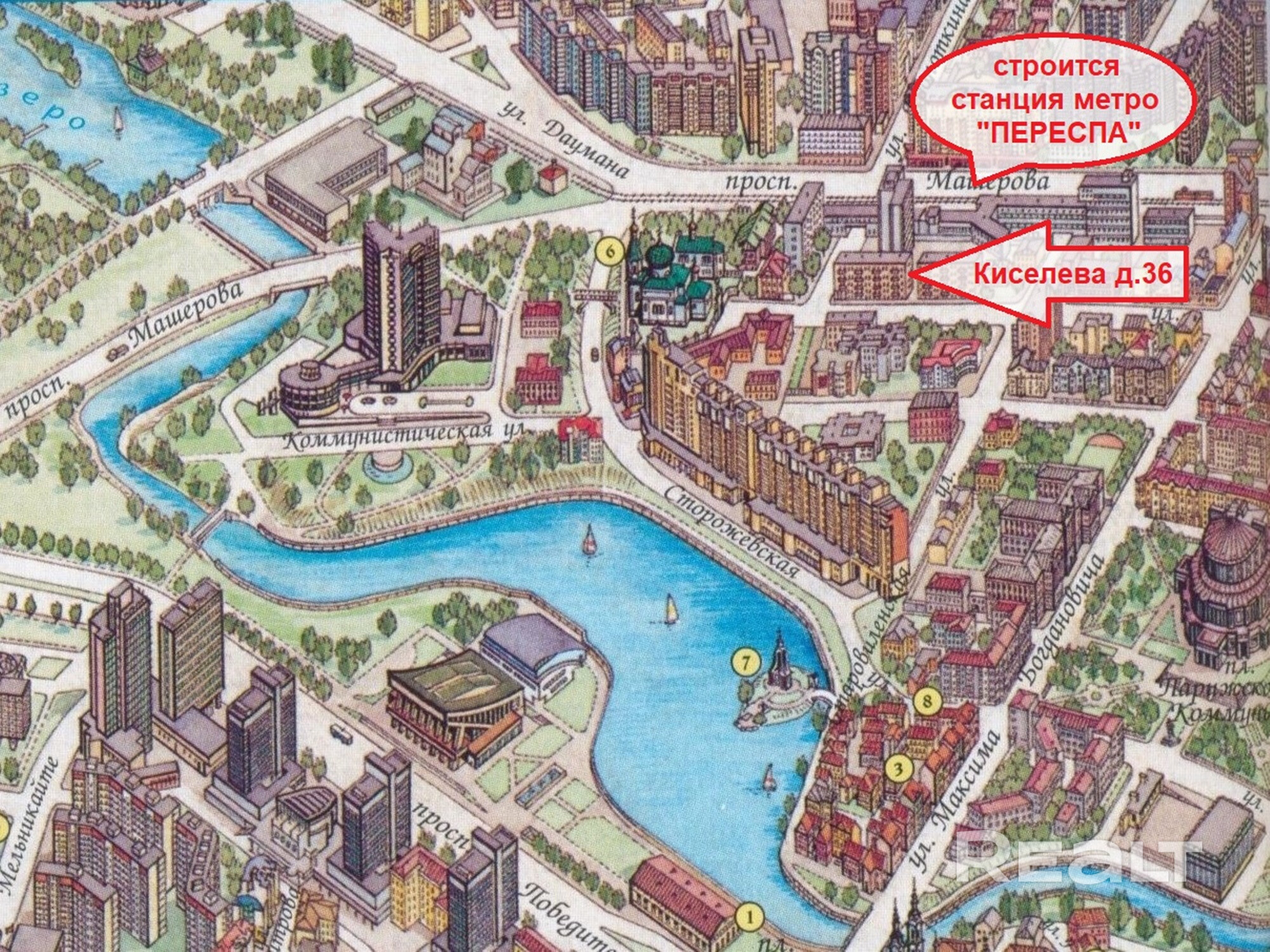 Отличное транспортное сообщение. В 5 минутах пешком строится новая станция метро "Переспа" (Зеленая ветка). Рядом с домом остановка общественного транспорта, на котором вы с легкостью сможете добраться в любую точку города. Станции метро "Площадь Победы" и "Немига" расположены в 15-ти минутах неспешным шагом.