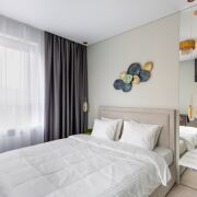 Спальня — тёплая, уютная, с домашним, расслабляющим интерьером: ковровое покрытие, мягкие оттенки, большая бьюти-зона и вместительный шкаф.