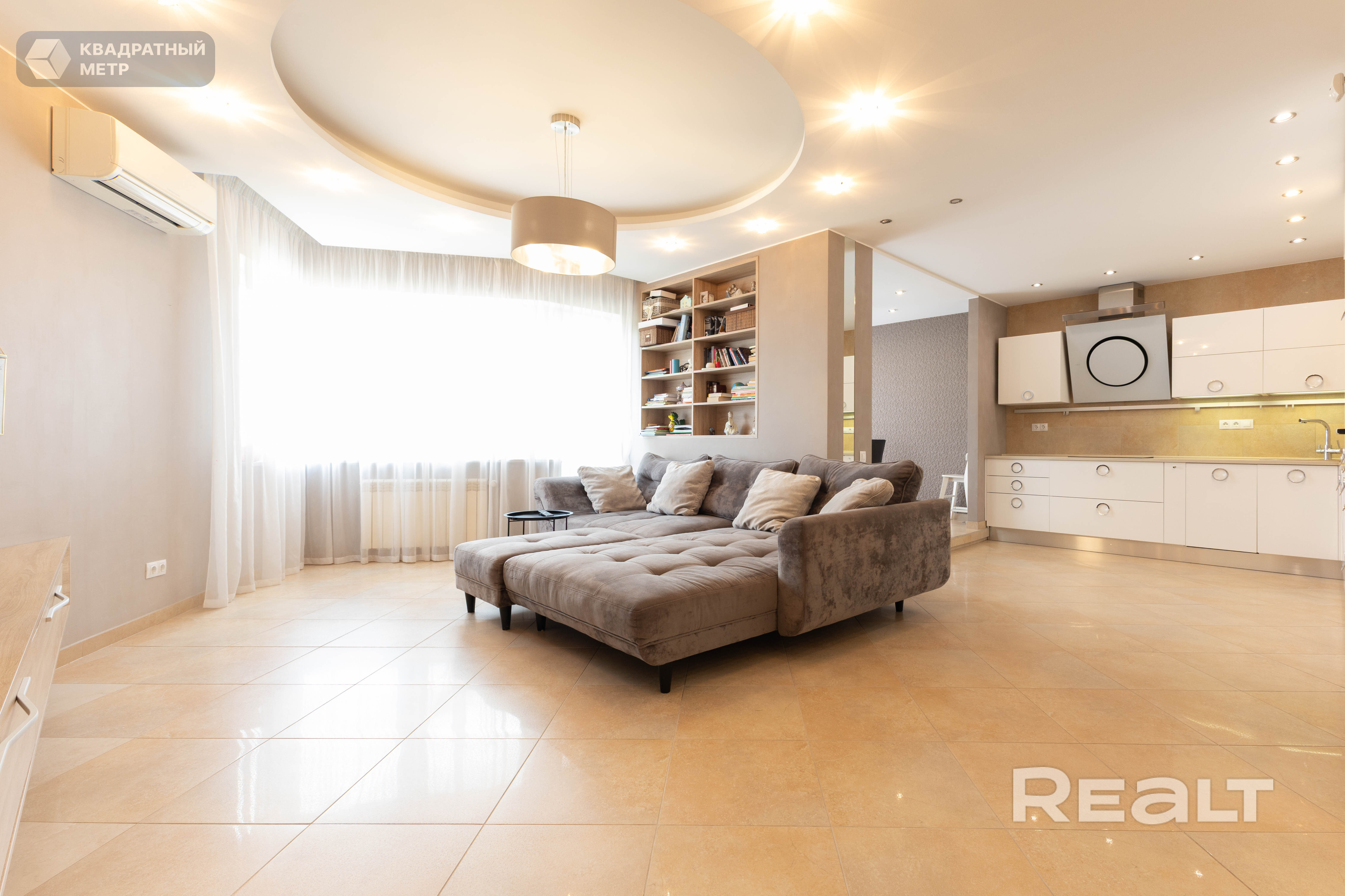 Эксклюзивное предложение на Гамарника, 16А! В квартире сделан дизайнерский ремонт с использованием качественных строительных материалов премиум класса. Стены окрашены, декоративная штукатурка `Ланкруста`, в с/у уложена испанская плитка, импортная сантехника `GROE`, теплые полы под плиткой, стиральная и сушильная машины `BOSCH`, кондиционеры, встроенная бытовая техника `BOSCH` и холодильник. В квартире предусмотрена вместительная гардеробная. Квартира готова к проживанию. Дом расположен в экологически-чистом районе Минска, в шаговой доступности парковая зона, развитая инфраструктура. Есть 2 машиноместа в подземном паркинге . Входят в стоимость.