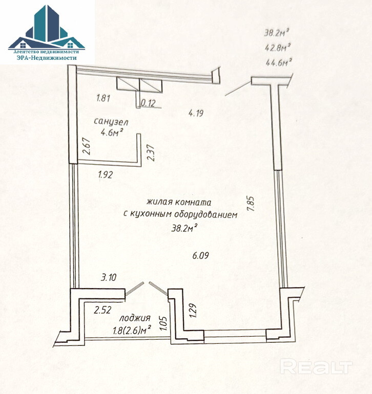 Квартира свободной планировки в жилом квартале «Южная Европа» дом «Флоренция». Площадь указана по СНБ-44,6 кв.м