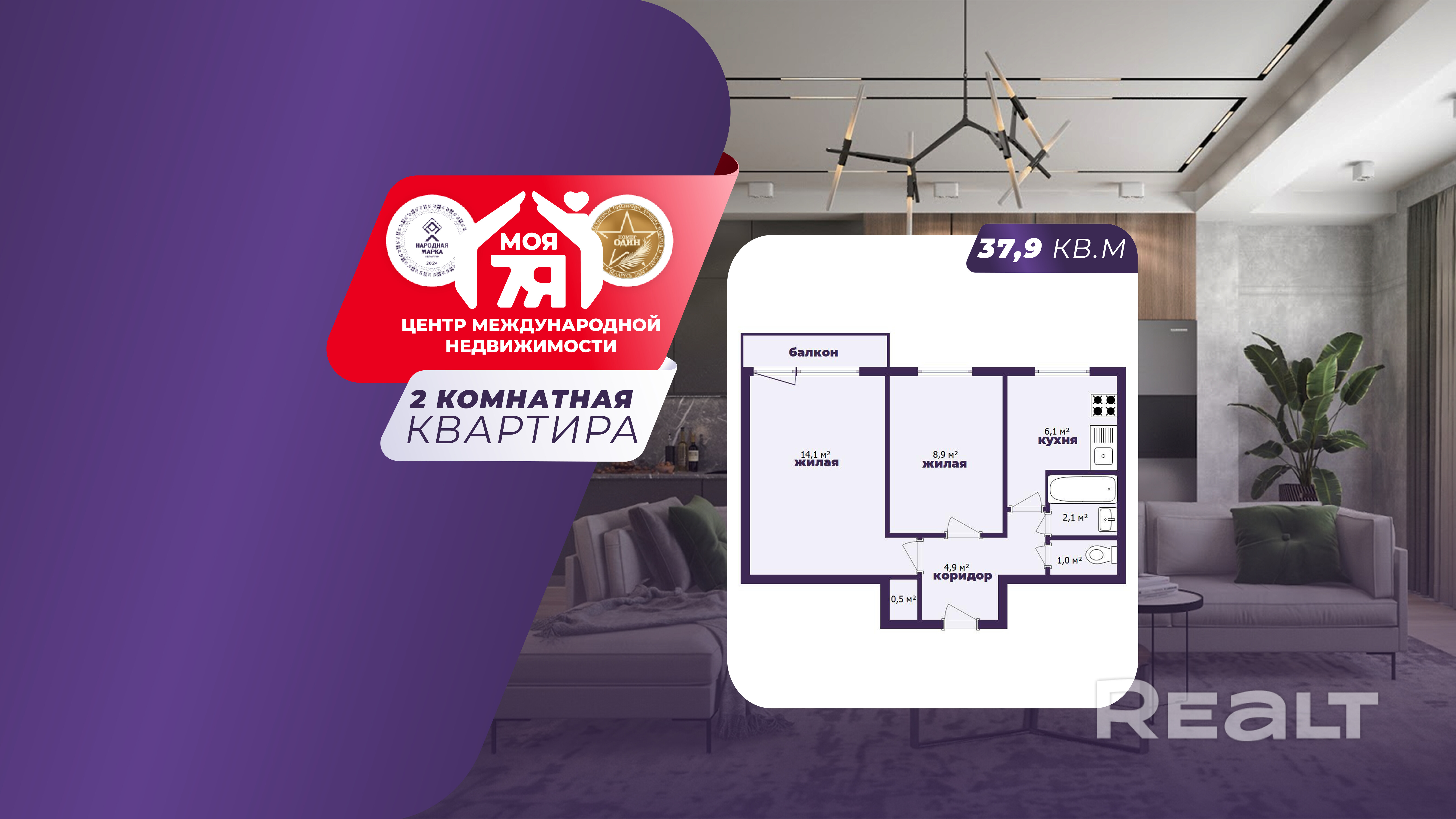 -Общая площадь по СНБ - 37,9 м2, удачная планировка включает две изолированные комнаты (14,6 и 8,9 м2), светлую кухню 6,1 м2.