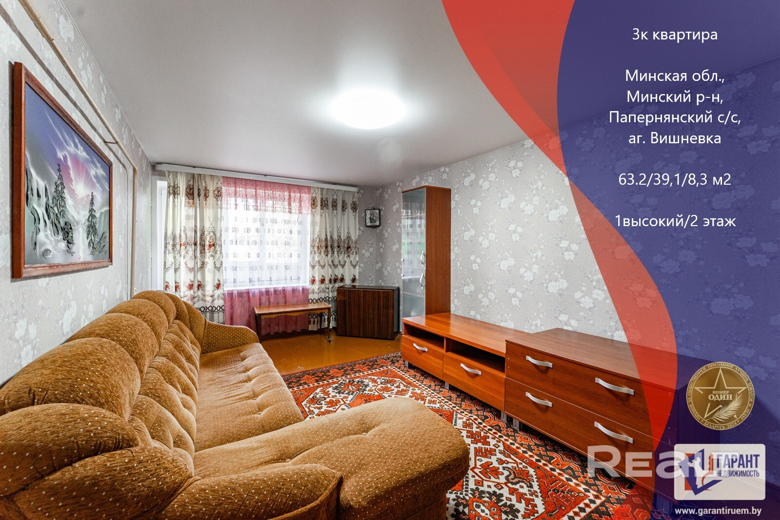 Квартира расположена на 1-ом этаже 2-этажного кирпичного дома 1980 года. Три изолированные комнаты 16,9м., 11,5м. и 10,7м., кухня 8,3м., раздельный санузел, большая застекленная лоджия. Есть подвал.