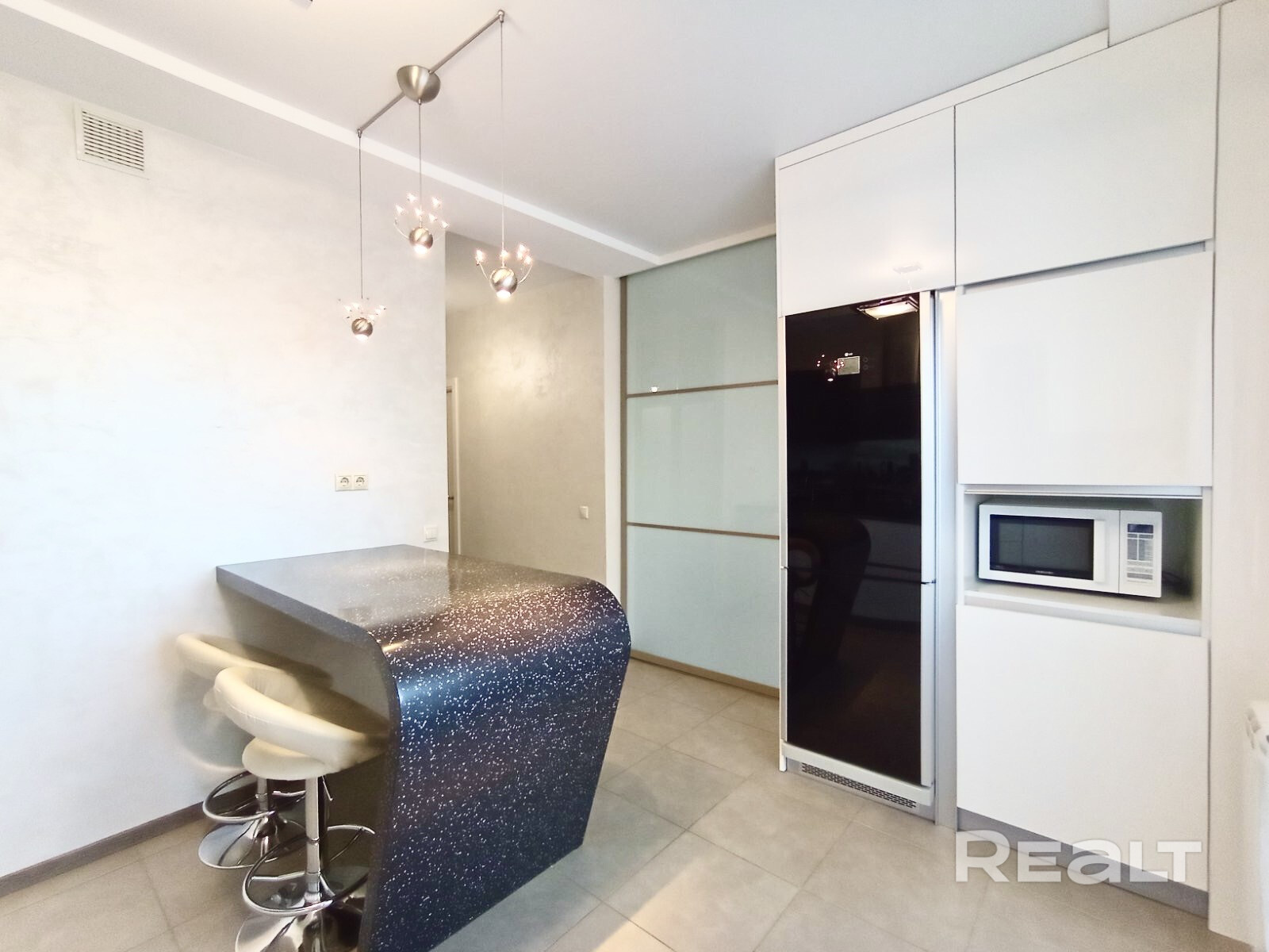 На кухне каменная барная стойка, с барными стульями, холодильник LG c сенсорным дисплеем, микроволновая печь Samsung,варочная поверхность и духовой шкаф Gorenje, посудомоечная машина Bosh, установлен фильтр двойной системы очистки воды ATOLL. На кухне все фасады крашенные.