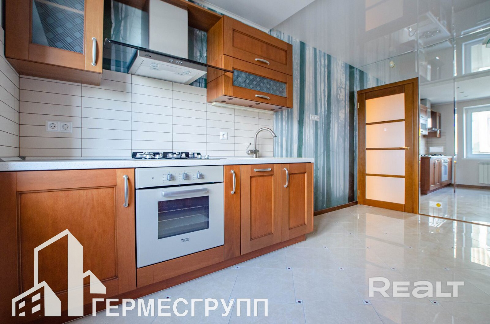 Встроенная кухня, фасады из массива made in Italy. Уникальные детали в квартире- авторские фотообои, зеркальная стена в кухне, умная система теплого пола.