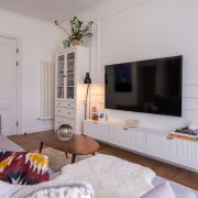 Гостиная оснащена комфортным диваном, подвесной тумбой под TV и телевизором Samsung с диагональю 65 дюймов (все провода спрятаны в кабель-канал).