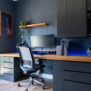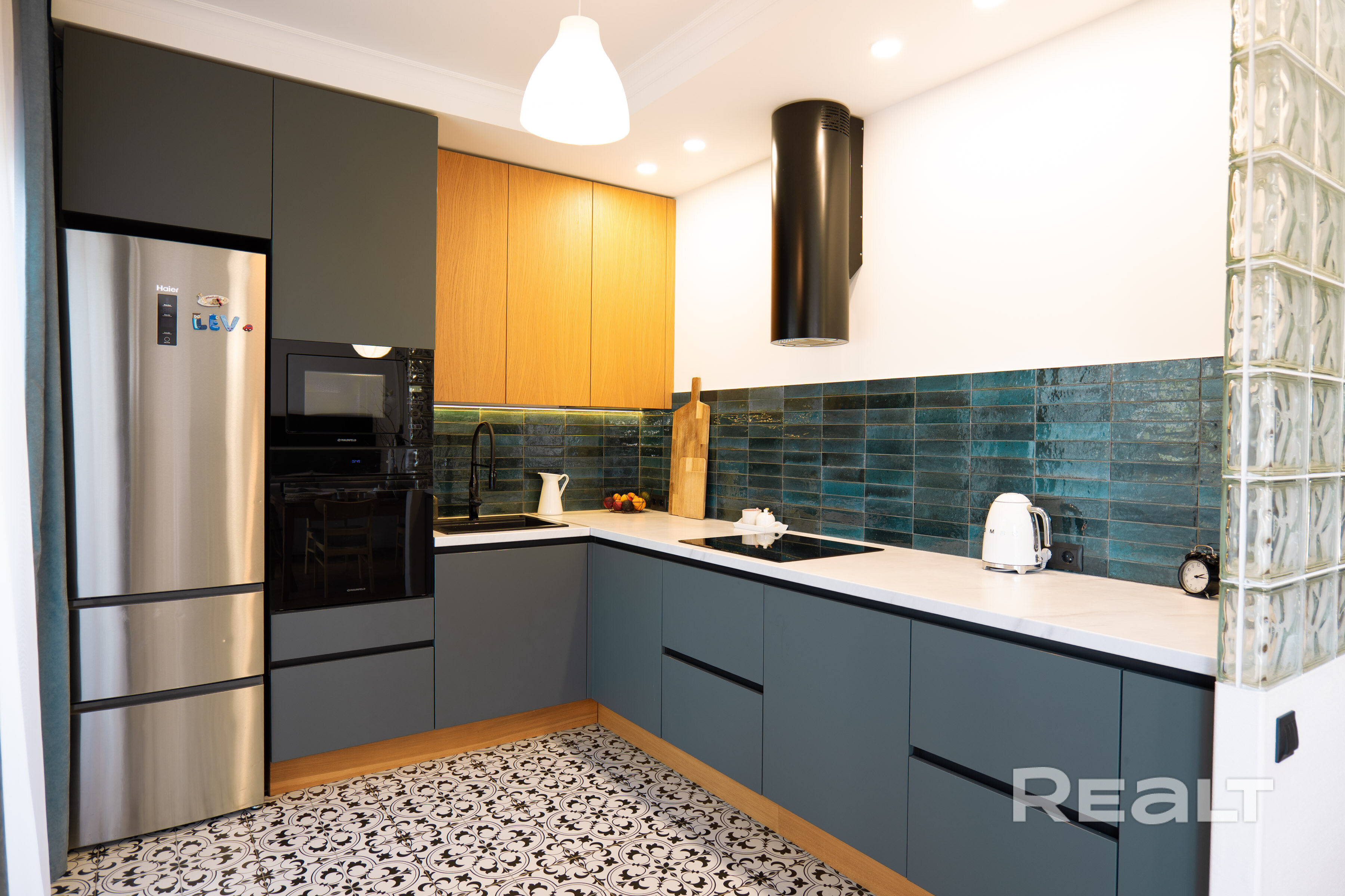 Встроенная кухня с фасадами Fenixизготовлена компанией GeosIdeal, оснащена доводчиками Blum, техникой (индукционная варочная поверхность, духовой шкаф, холодильник, большая посудомоечная машинка, встроенная СВЧ-печь) и имеет глубину 70см, а высоту 94см. Установлена подсветка рабочей зоны и есть подготовка под измельчитель бытовых отходов.