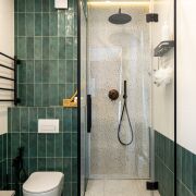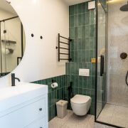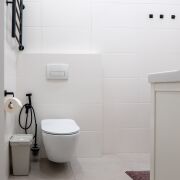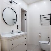 В санузлах установлены инсталляции Geberit, подвесные унитазы, тумбы с раковинами, зеркала, есть и ванна и душевая кабина.