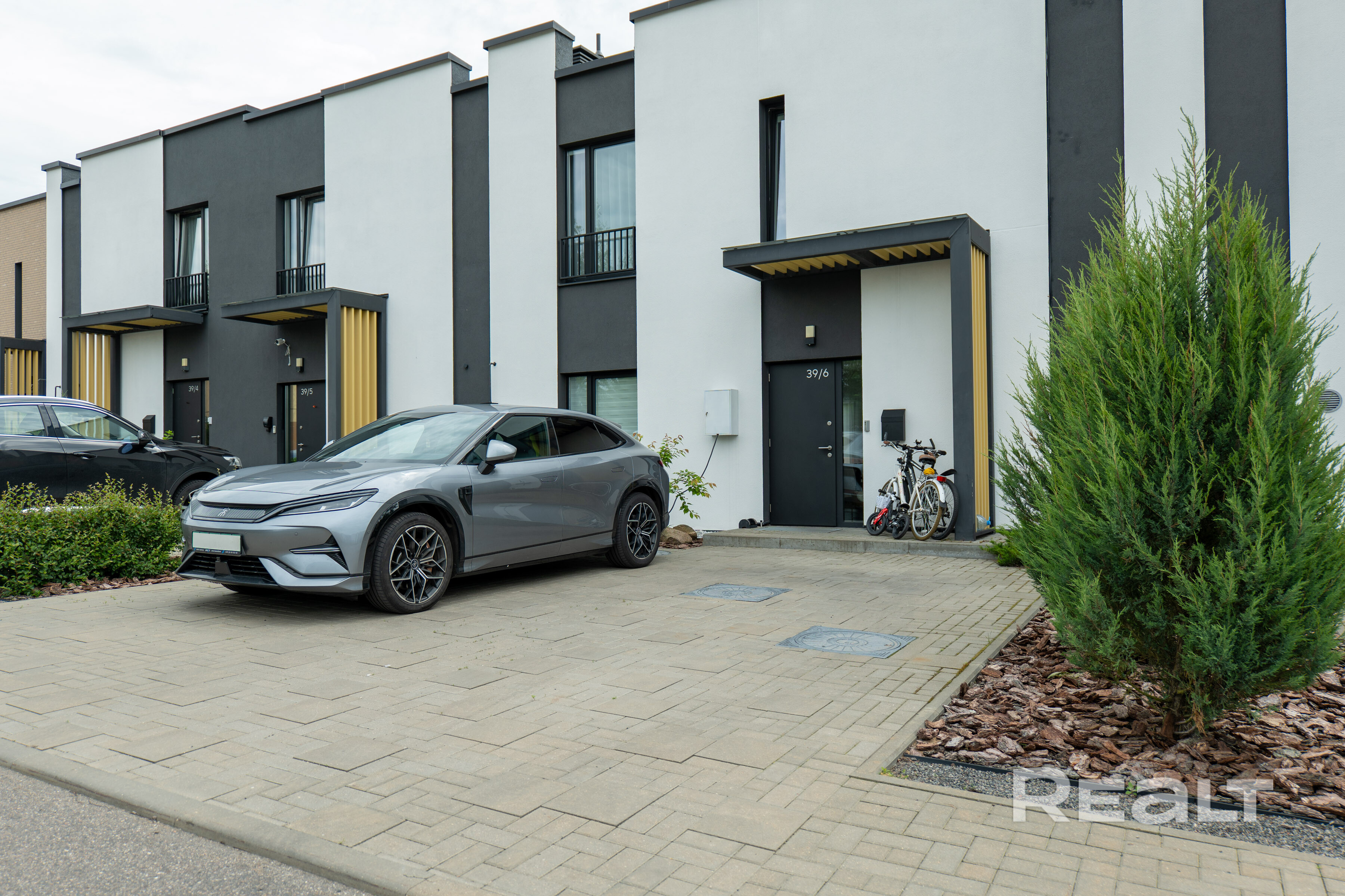 Прямо возле дома есть парковочные места для двух машин и выведена станция для электрозарядки.