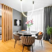 Объединение гостиной и кухни в единое пространство – это не только модный тренд, но и залог непринужденного общения и ощущения простора. Здесь этот прием реализован с особым вкусом. Кухня оснащена самой современной техникой: встроенный духовой шкаф, микроволновая печь и посудомоечная машина обеспечивают максимальное удобство. Обеденная зона украшена столом ручной работы, созданным по индивидуальному заказу, и дополнена эффектной люстрой. Ее мягкий, приглушенный свет создает интимную атмосферу, идеальную для уютных ужинов и душевных бесед. Текстура и оттенок стола тщательно подобраны, чтобы гармонировать с общим стилем интерьера.