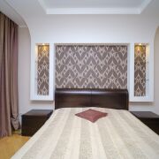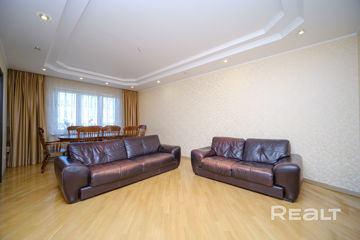 На полу комфортный натуральный дубовый паркет, многоуровневые белоснежно-белые потолки с подсветкой.