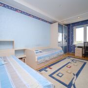 Детская комната организована для двоих детей. Два спальных места, спортивный комплекс для занятия физическими упражнениями, встроенный шкаф купе с автомобильной тематикой на фасаде письменный стол, вся мебель выполнена под заказ.