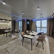 – Квартира со свободной планировкой: изолированная спальня и большая кухня-гостиная. На кухне обеденная группа, состоящая из стола и шести мягких кресел. Кухня с качественной фурнитурой и фасадами из нанопластика soft touch.