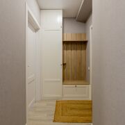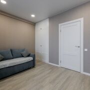 Новая, укрепленная входная дверь. Межкомнатные двери - экоэмаль. Шкафы в комнате и прихожей изготовлены из ЛДСП EGGER. Напольное покрытие - кварц-винил. Потолки натяжные. Комната оклеена светлыми обоями (производство Бельгия).