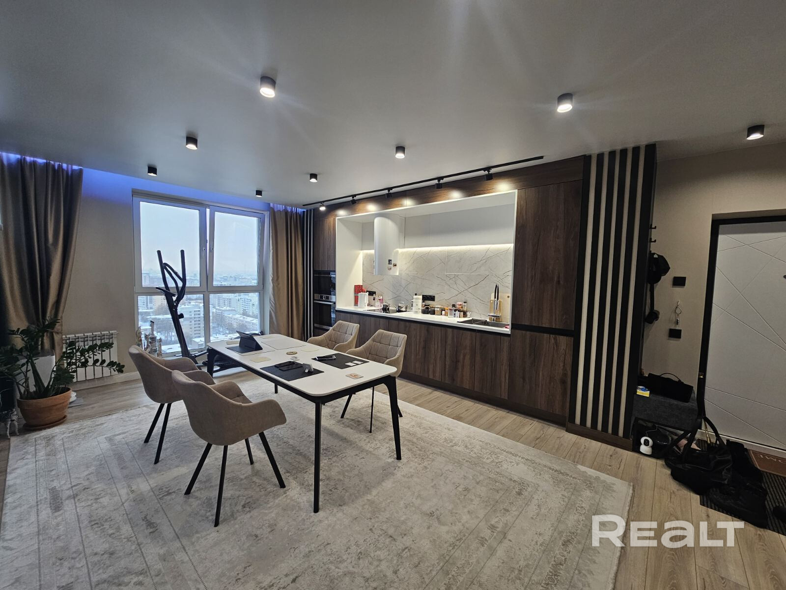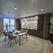 – Квартира со свободной планировкой: изолированная спальня и большая кухня-гостиная. На кухне обеденная группа, состоящая из стола и шести мягких кресел. Кухня с качественной фурнитурой и фасадами из нанопластика soft touch.