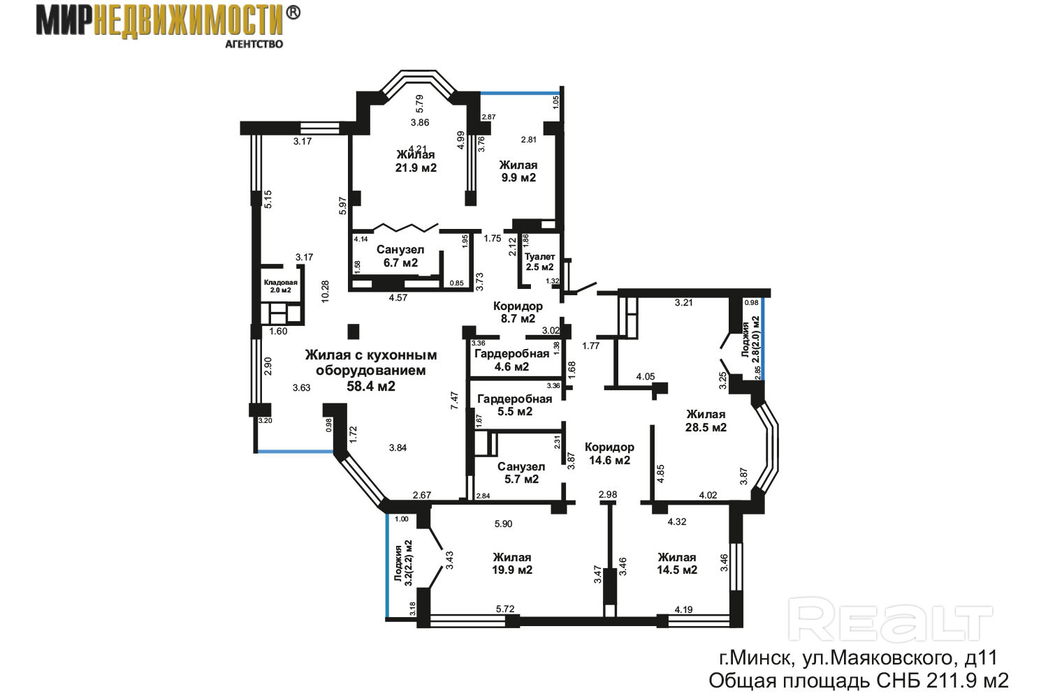 Общая площадь 203,4 кв.м., площадь по СНБ 211,9 кв.м., жилая 155,1 кв.м. Высота 2,72 м. 3 с/у, 2 застекленные лоджии.