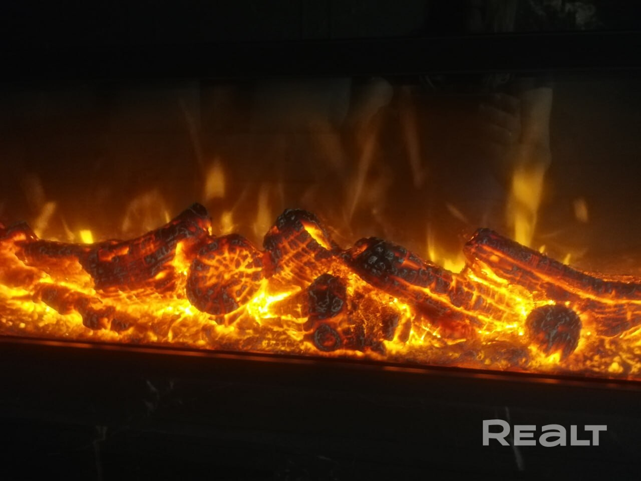 В гостиной установлен современный камин, удобный дизайнерский диван, обеденный стол со столешницей из керамогранита и стулья с вращающимся механизмом.