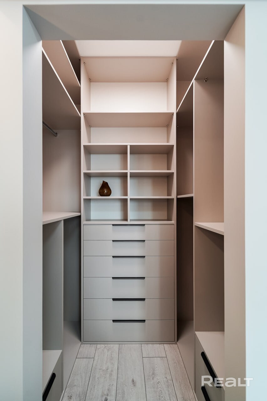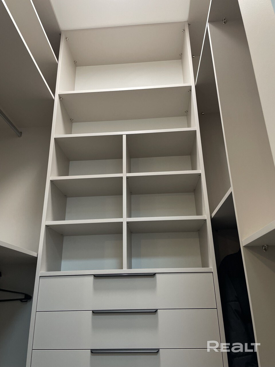 В спальне имеется вместительная гардеробная с множеством выдвижных ящиков. Кровать оснащена подъёмным механизмом. Качественный ортопедический матрас.