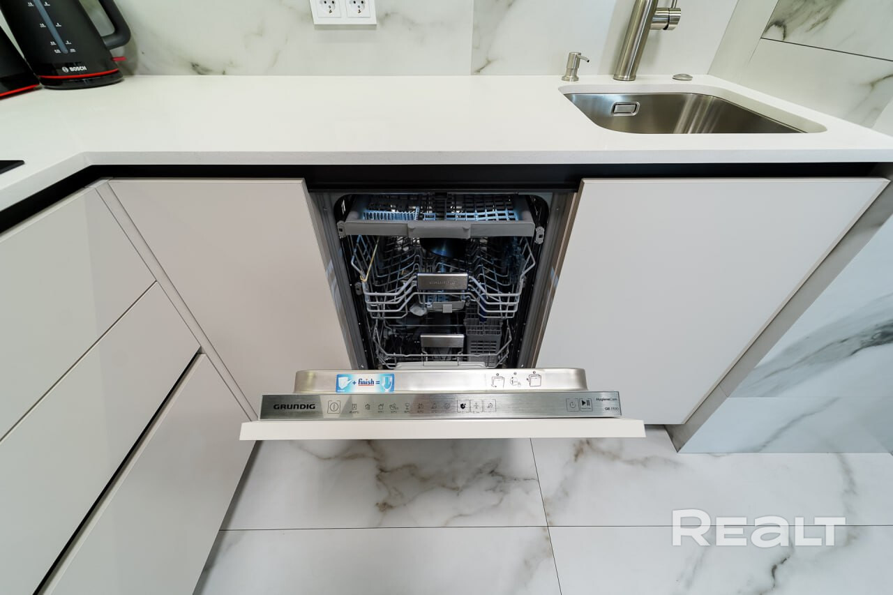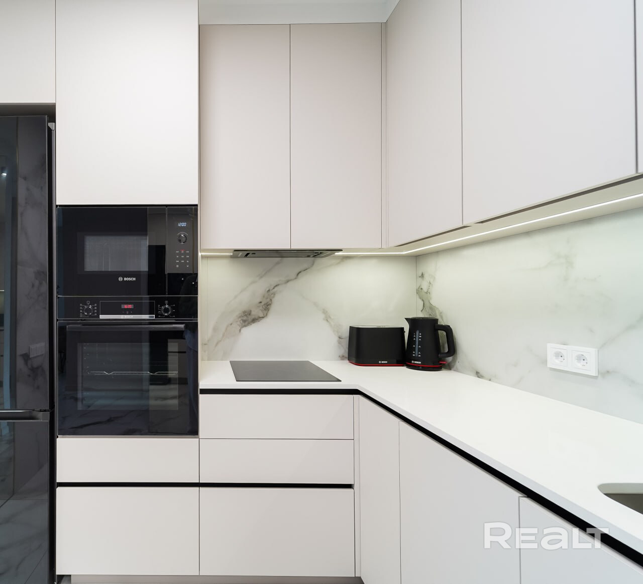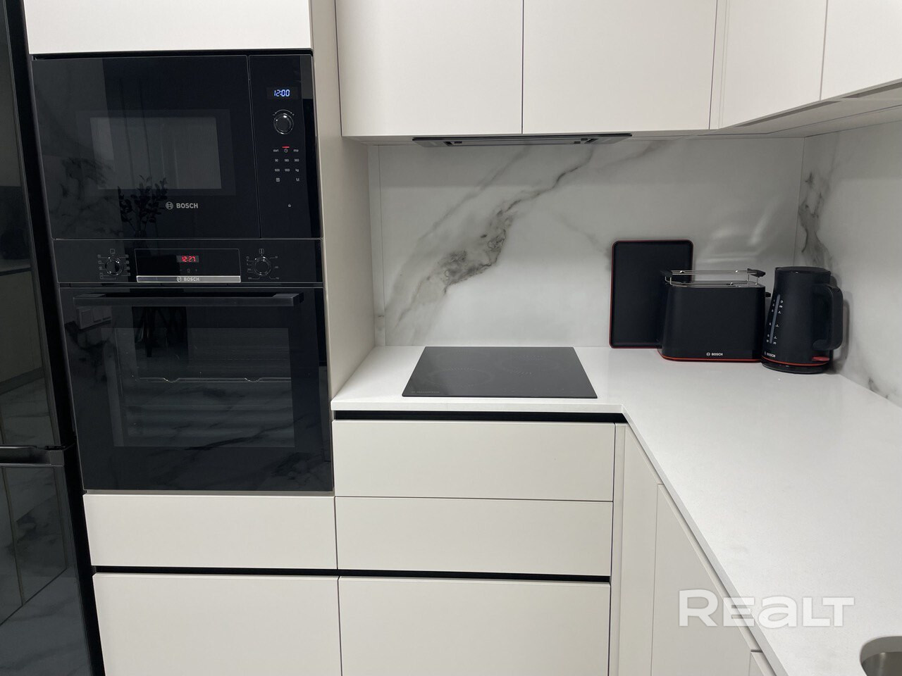 Встроенная, очень вместительная кухня премиум класса оснащена современной техникой от ведущих производителей: Холодильник Samsung с дверцами из черного стекла, духовой шкаф Bosch с телескопическими направляющими, микроволновая печь Bosch, индукционная варочная панель 45 см. и мощная вытяжка и обратным клапаном, посудомоечная машина на 14 комплектов и 8 программ. Вся бытовая техника с продлённой гарантией до 5 лет. Тостер Bosch и электрочайник Bosch.