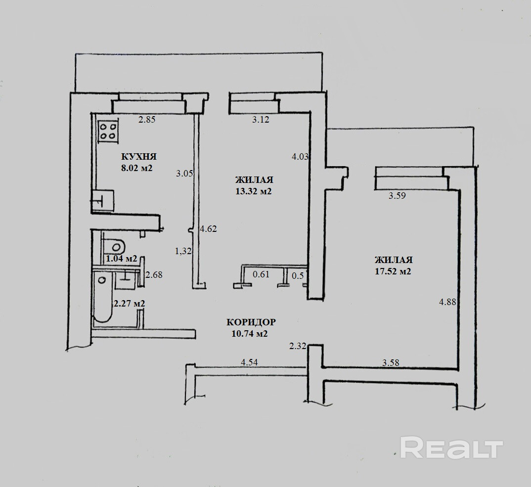 - Удачная планировка: просторная жилая зона (30,8 м2), кухня 8 м2