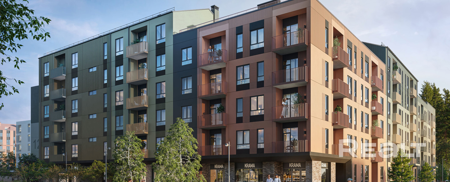 Территория закрытая, двор без машин, сохранены лесные деревья — прогулочные зоны, комфорт и безопасность. Парковочные места вынесены за пределы двора.