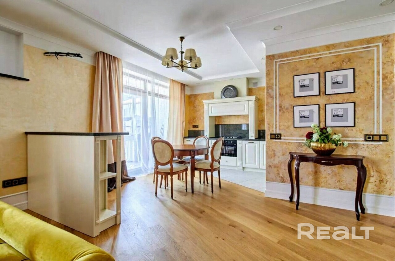Квартира расположена на 4-5-м этажах кирпичного дома 2013 года постройки. В квартире 4 изолированных комнаты, 3 санузла , 2 гардеробных, гостиная с кухней объединены .