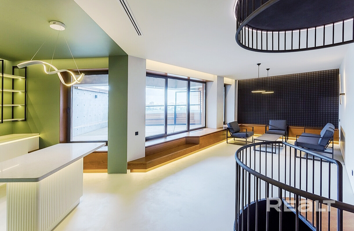 - лаунж-зона с выходом на просторную террасу 27 кв. м. с регулируемой стеклянной защитой, с которой открывается прекрасный вид на набережную реки Свислочь,