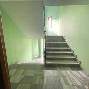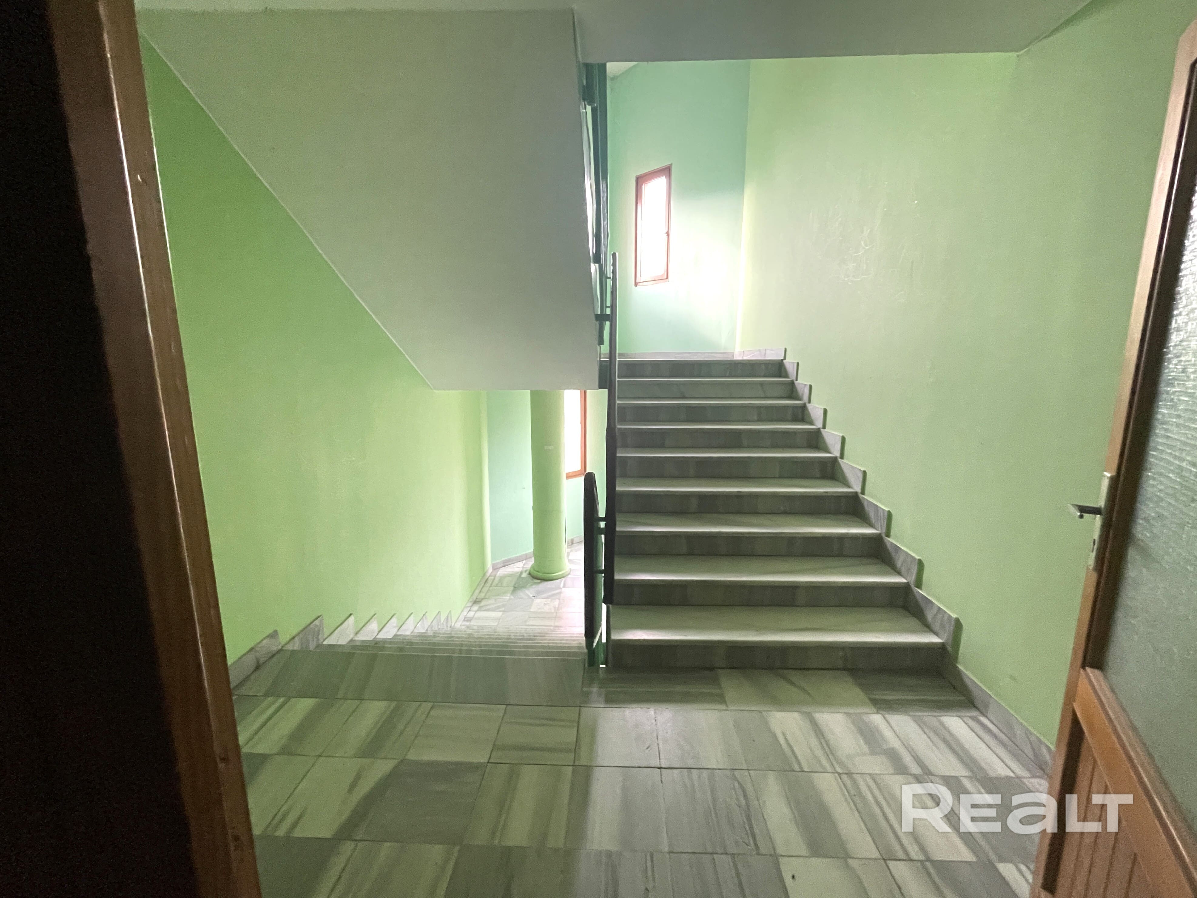 Чистый и ухоженный подъезд с широкими мраморными лестничными проемами и просторными площадками.