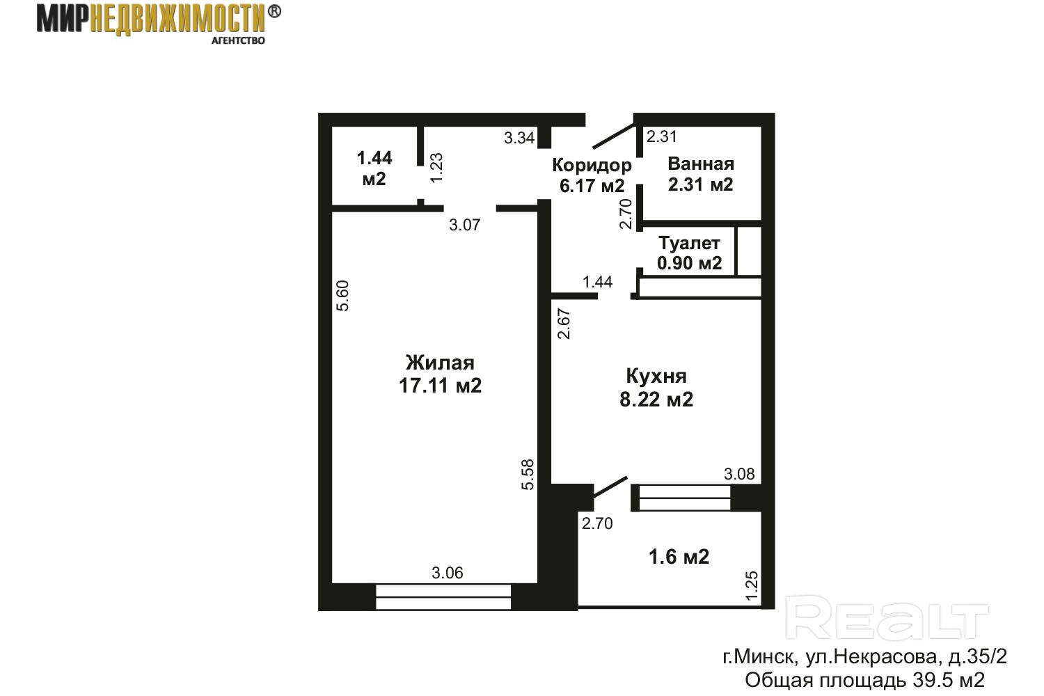2. Квартира расположена на 1 высоком этаже 9 этажного панельного дома 1984 года постройки, окна выходят во двор. Площадь по СНБ 39,5 кв.м., общая 36.2 кв.м, жилая 17.1 кв.м, кухня 8,22 кв.м. Санузел раздельный, высота потолков 2,53 м.