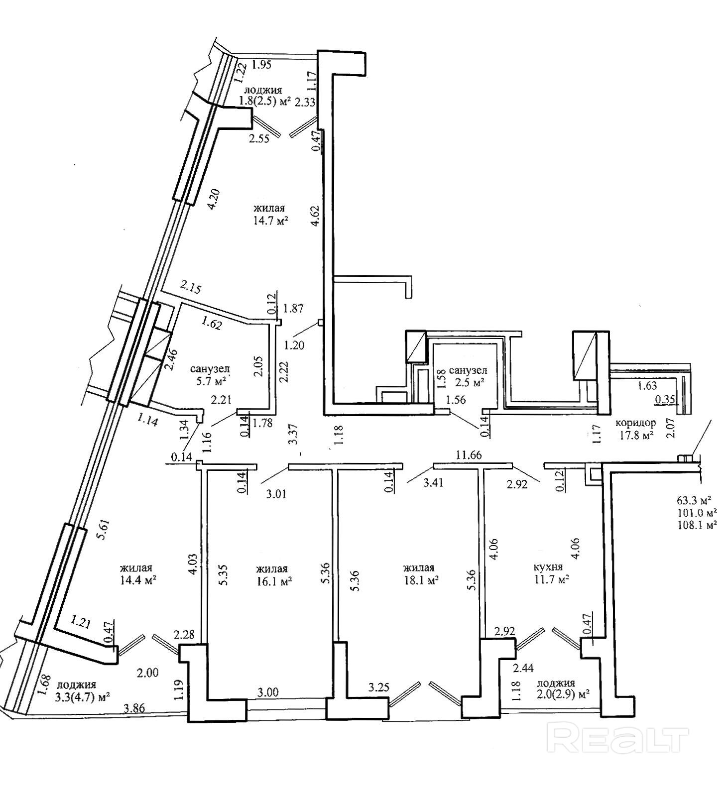Площадь по СНБ 108.1 м2., внутри периметра квартиры несущие стены отсутствуют – можно совместить во своему желанию кухню с соседней комнатой или демонтировать любые другие перегородки.