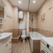 Санузел совмещённый: удобный и просторный, с качественным ремонтом, есть выводы для подключения стиральной машины, большая акриловая ванна, места для хранения.