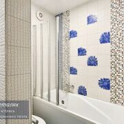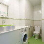 Белая плитка, светло-зелёный пол, дизайнерская раковина.