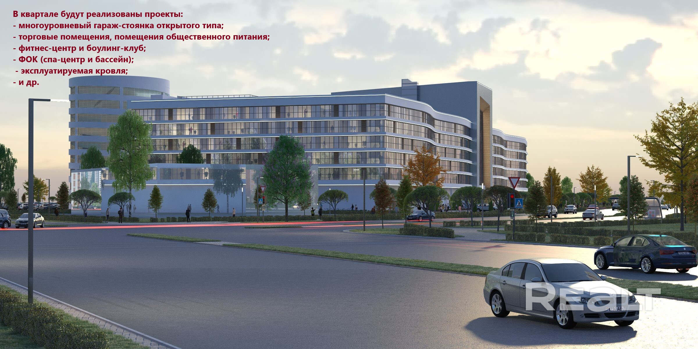В квартале планируются торговые помещения продовольственного супермаркета и непродовольственного гипермаркета, помещения общественного питания, фитнес-центр, боулинг-клуб, спа-центр и др.
