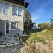 Входная дверь сразу с выходом на просторный участок, с зоной отдыха для барбекю, детской площадкой.