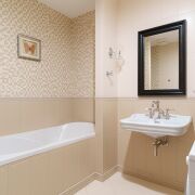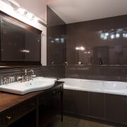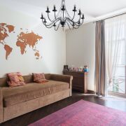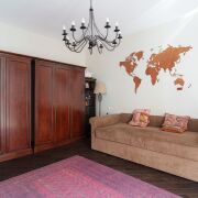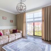 · В гостиной установлен камин, антикварная мебель, итальянские светильники, английский диван, стол из итальянских материалов. Красивая кухня выполнена из итальянских материалов, техника Smeg, Liebherr, Bosch. Два санузла с итальянской и немецкой сантехникой.
