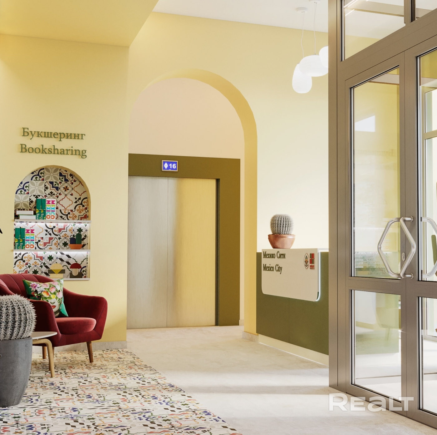 Дизайнерское лобби, стойка для консьержа и зона ожидания.