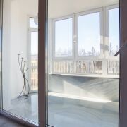 Серую сдержанную спальню украшает окно в пол с патио-системой и выходом на уникальную лоджию, облицованную керамогранитом под оникс. Большая вертикальная батарея, теплый пол и двойное утепление лоджии сделает ваш отдых глубоким и приятным.