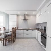 Гостиная и кухня объединены широким строгим порталом. Эркерное окно (почти в пол) делает кухню очень светлой, здесь вам будет комфортно готовить и просто проводить время. На полу керамогранит с матовой бархатной поверхностью, на котором не скользко и приятно ходить босиком. Практичная столешница Egger, холодильник Liebherr, индукц.плита, эл.духовка, посудомойка, вытяжка. Вместительная гардеробная в гостиной позволяет при необходимости поставить отдельную морозильную камеру. Большой угловой диван со спальным местом в гостиной и телевизор делает это место любимым у домашних.