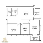 Квартира имеет просторную планировку, которая включает в себя кухню-гостиную, 3 спальни, 2 санузла и 2 лоджии.