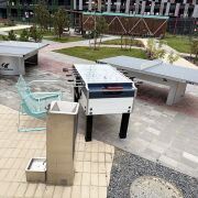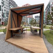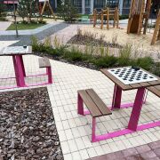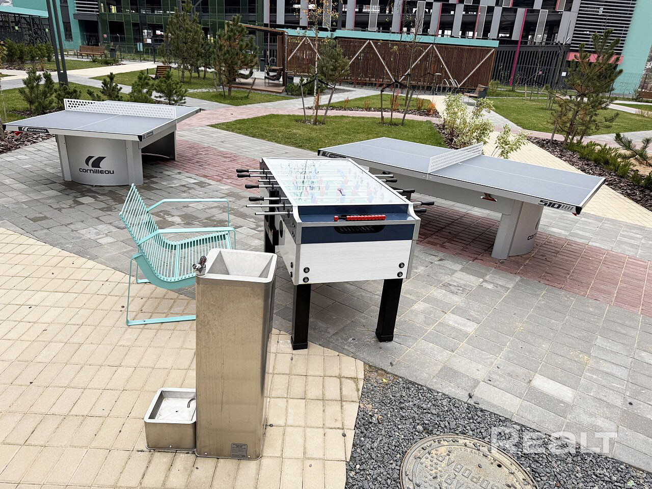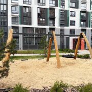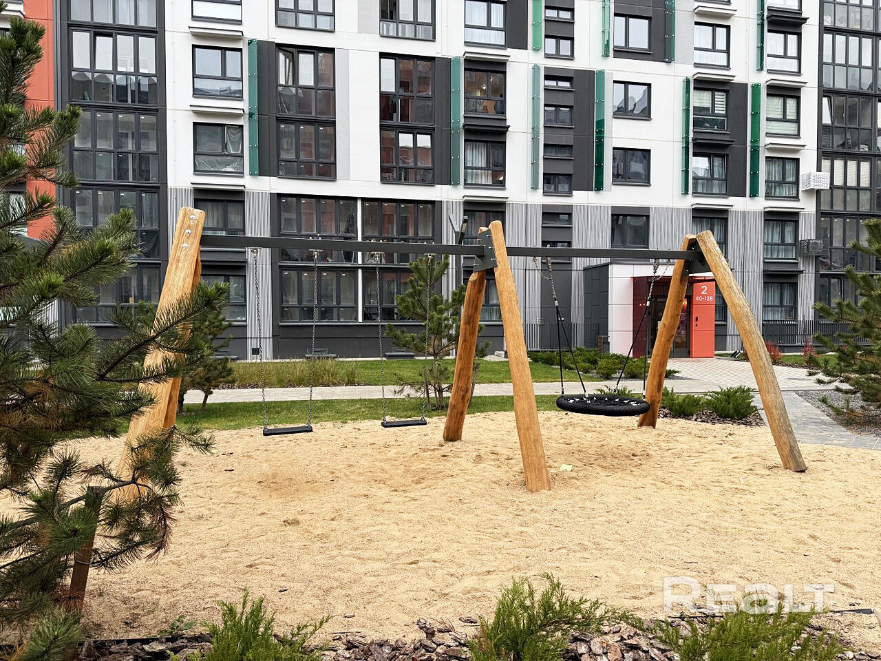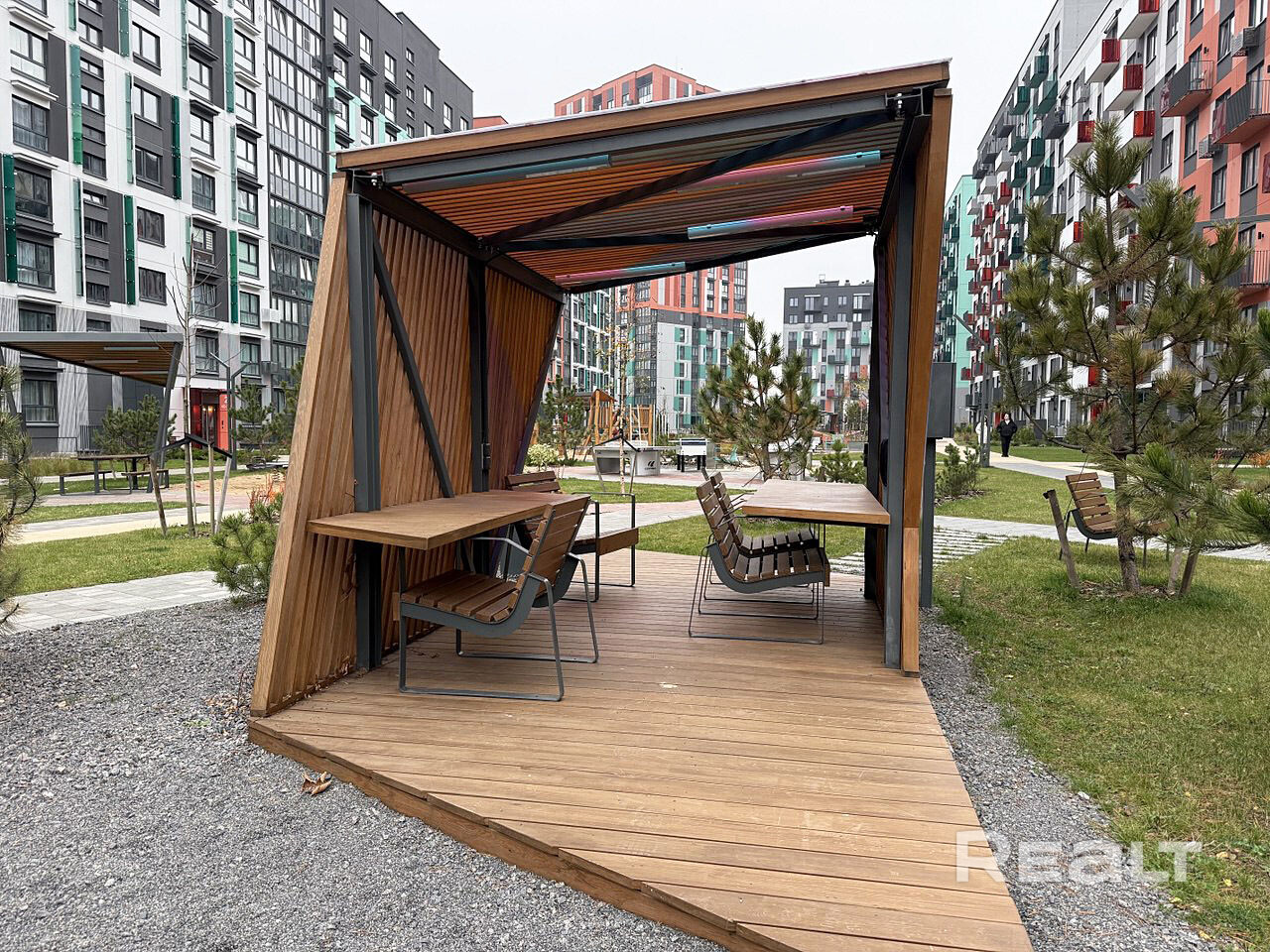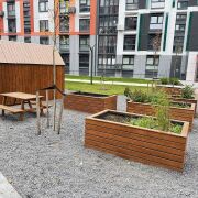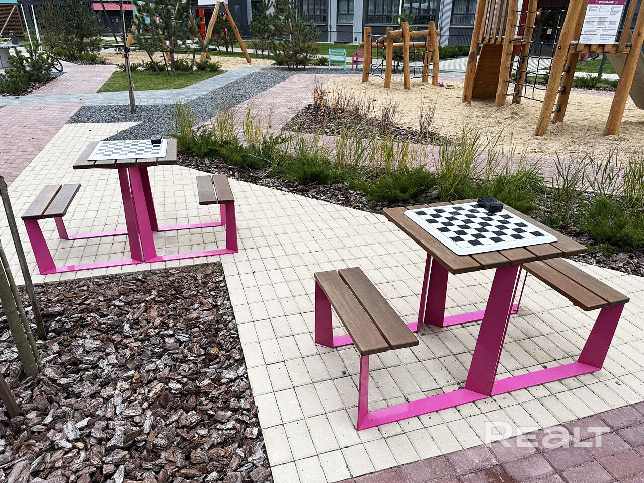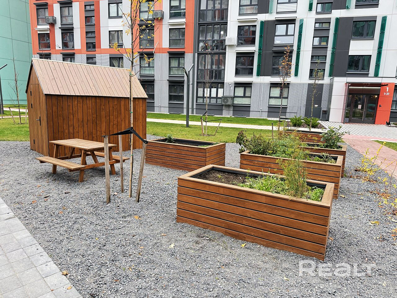 Во дворе расположены современные детские площадки, зона с настольными играми, мини огороды, зона барбекю и множество зелени.