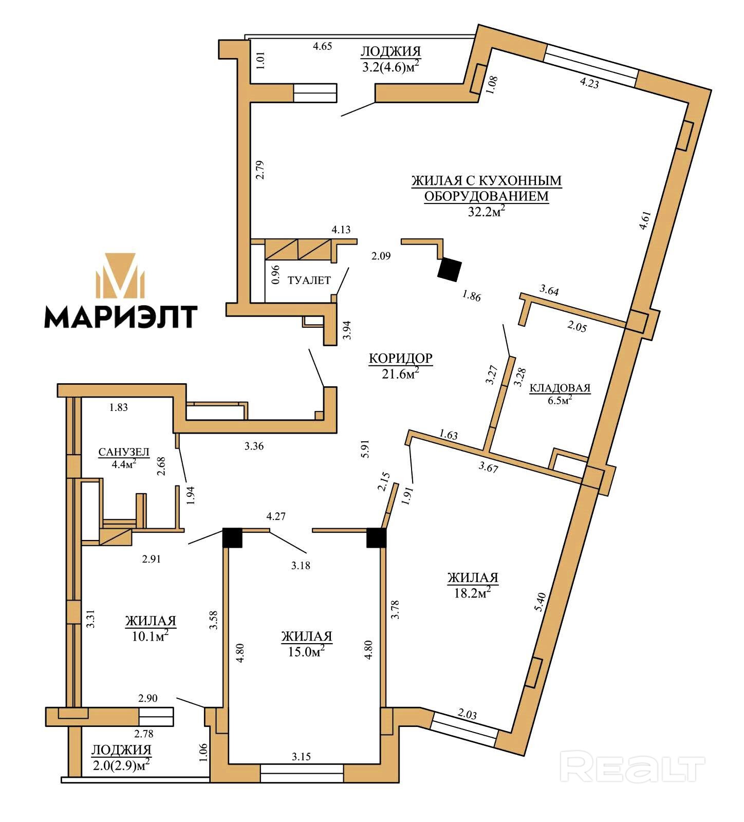 Удобная и практичная планировка! Квартира с четырьмя раздельными комнатами. Площадь - 114,5 кв.м. Сделано удобное зонирование квартиры. Три отдельные комнаты и гостиная с кухней. Два санузла. Большая прихожая и гардеробная/кладовка. Дополнительно есть место для хранения в общем коридоре, свой тамбур. Две лоджии; одна из лоджий (4,6 кв.м.) на кухне - удобно и практично.