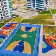 спортивная арена, велодорожки по всему комплексу, теннисные площадки, волейбольные и баскетбольные площадки.