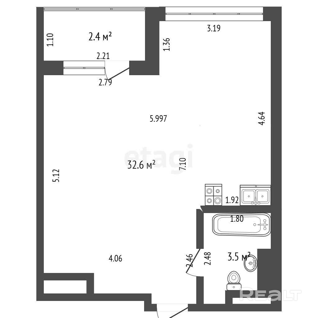 Оборудованная кухня-гостиная со встроенной мебелью и техникой.