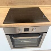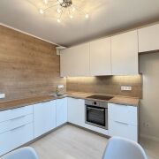 Встроенная кухня с подсветкой рабочей зоны, доводчиками и техникой (варочная поверхность, духовой шкаф и вытяжка).