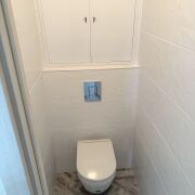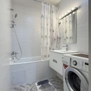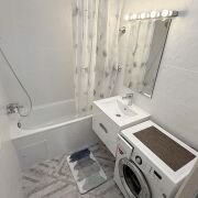 Раздельный санузел облицован плиткой, установлена инсталляция, подвесной унитаз, металлическая ванна, подвесная тумба с раковиной, зеркало с подсветкой, стиральная машинка, а все коммуникации спрятаны за скрытым люком.