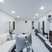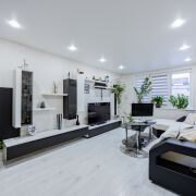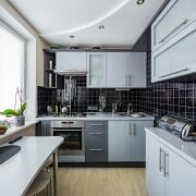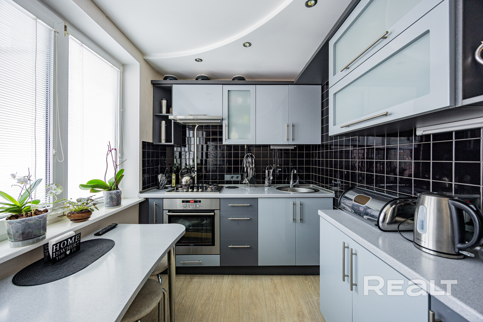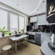* Современные покрытия: стильная плитка на кухне и практичный ламинат в комнате.